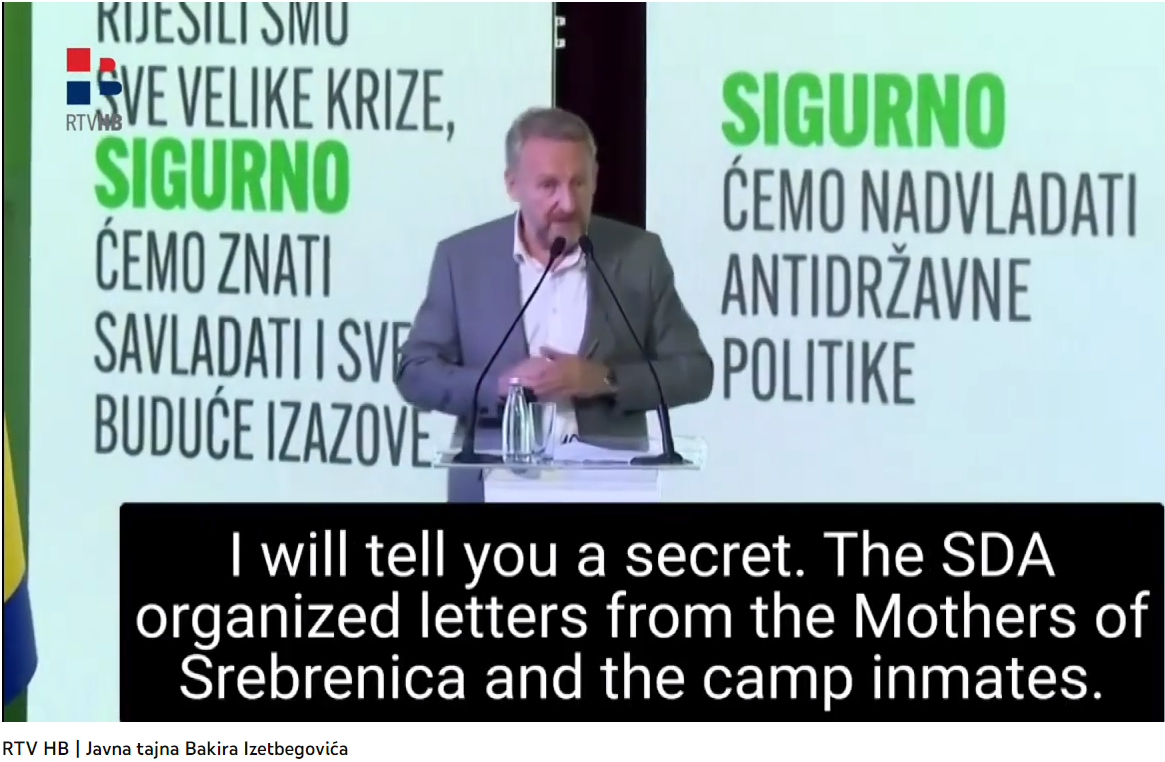 Bakir Izetbegvić, predsjednik SDA, javno je priznao da pisma koja su poslana na tisuće adresa od Majki Srebrenice i logoraša pisali predstavnici iz SDA, a bili su potpisani od strane Majki Srebrenica i logoraša.