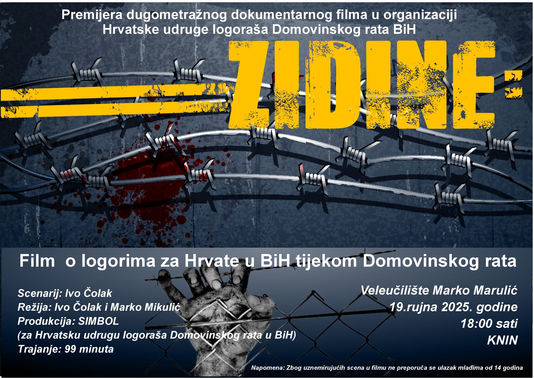U organizaciji Hrvatske udruge logoraša Domovinskog rata u BiH, 19. rujna 2025. godine s početkom u 18:00 sati na Veleučilištu Marka Marulića u Kninu, održat će se premijera dugometražnog dokumentarnog filma "Zidine".