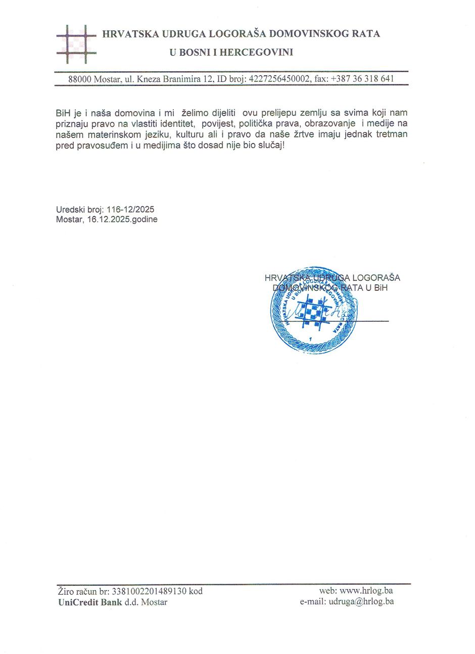 Članovi Hrvatske udruga logoraša Domovinskog rata u BiH koja pored zatočenika srpskih logora okuplja i preživjele logoraše 331 logora za Hrvate koje je proteklom ratu u BiH imala vojska koja kako navode sebe naziva Armijom BiH, uputili su pismo potpore i
